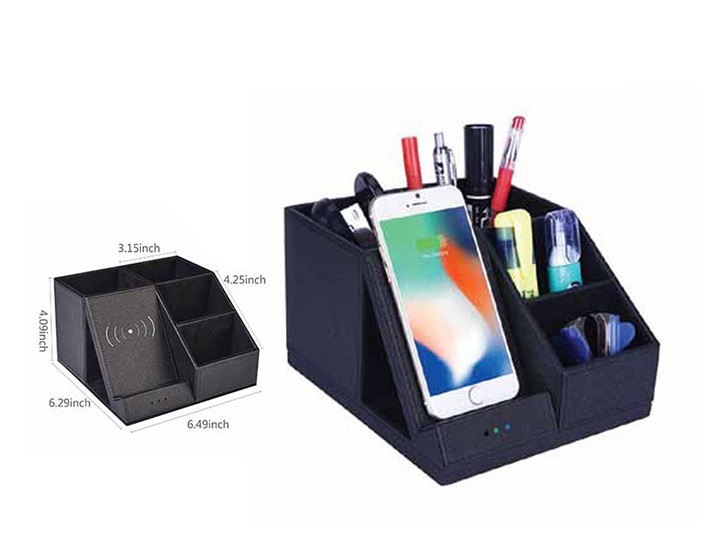 Desktop items classification optimization management with Wireless Charger Station for iPhone,Samsung Galaxy Qi-standard wireless charged phones. Work with DC 5V 3A adapter,can charging three electronic device at the same time, 4 compartments to organize all your pen/card/scissor/glasses writing instruments etc.